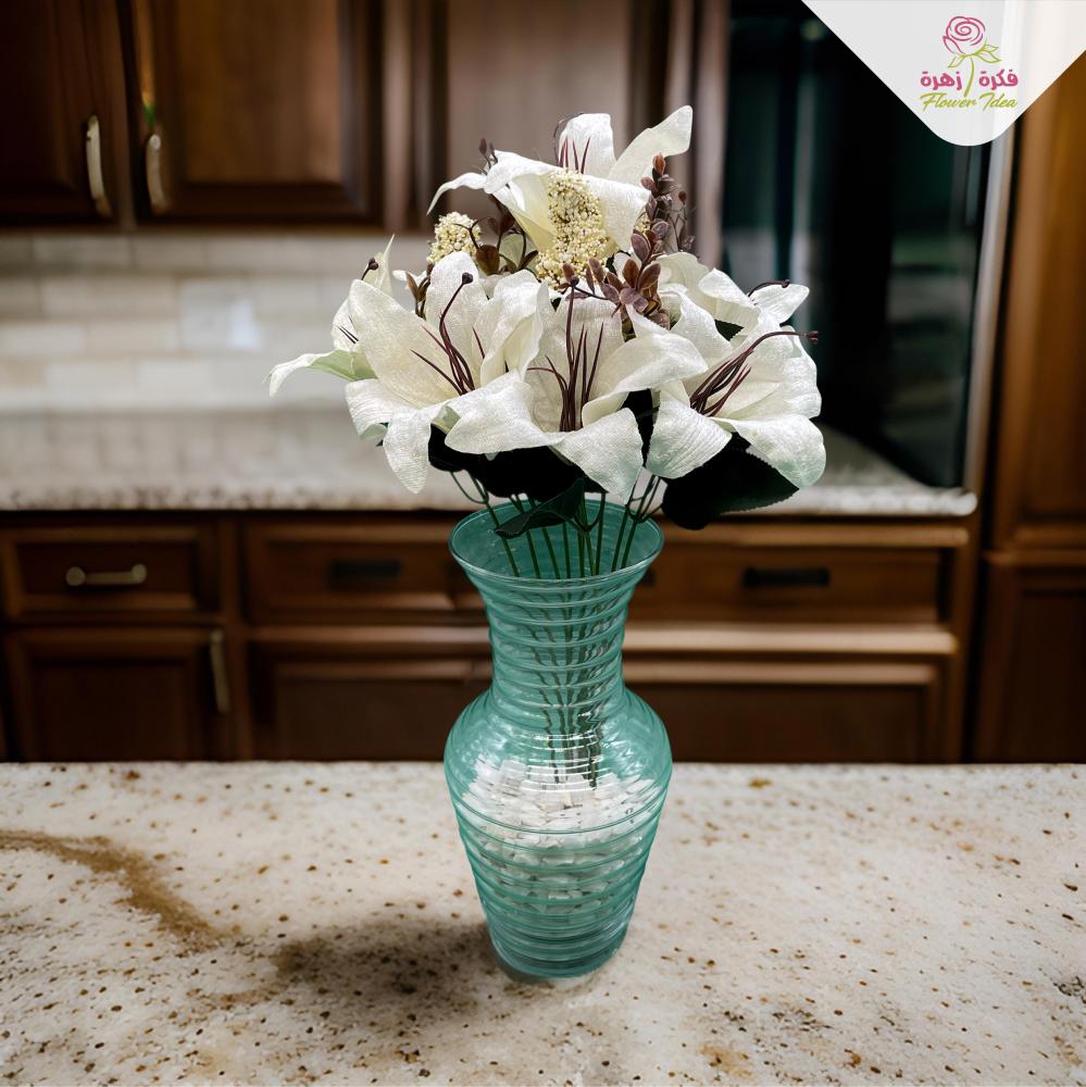 يجسد هذا التصميم الأنيق أزهار الليليوم بملمس قطيفي ناعم ، مما يضفي لمسة من الفخامة والرقي على أي ديكور. مثالية لتزيين المناسبات الخاصة أو لتوفير لمسة من الأناقة الطبيعية في منزلك، مع ضمان الحفاظ على تألقها وجمالها دون الحاجة إلى عناية.